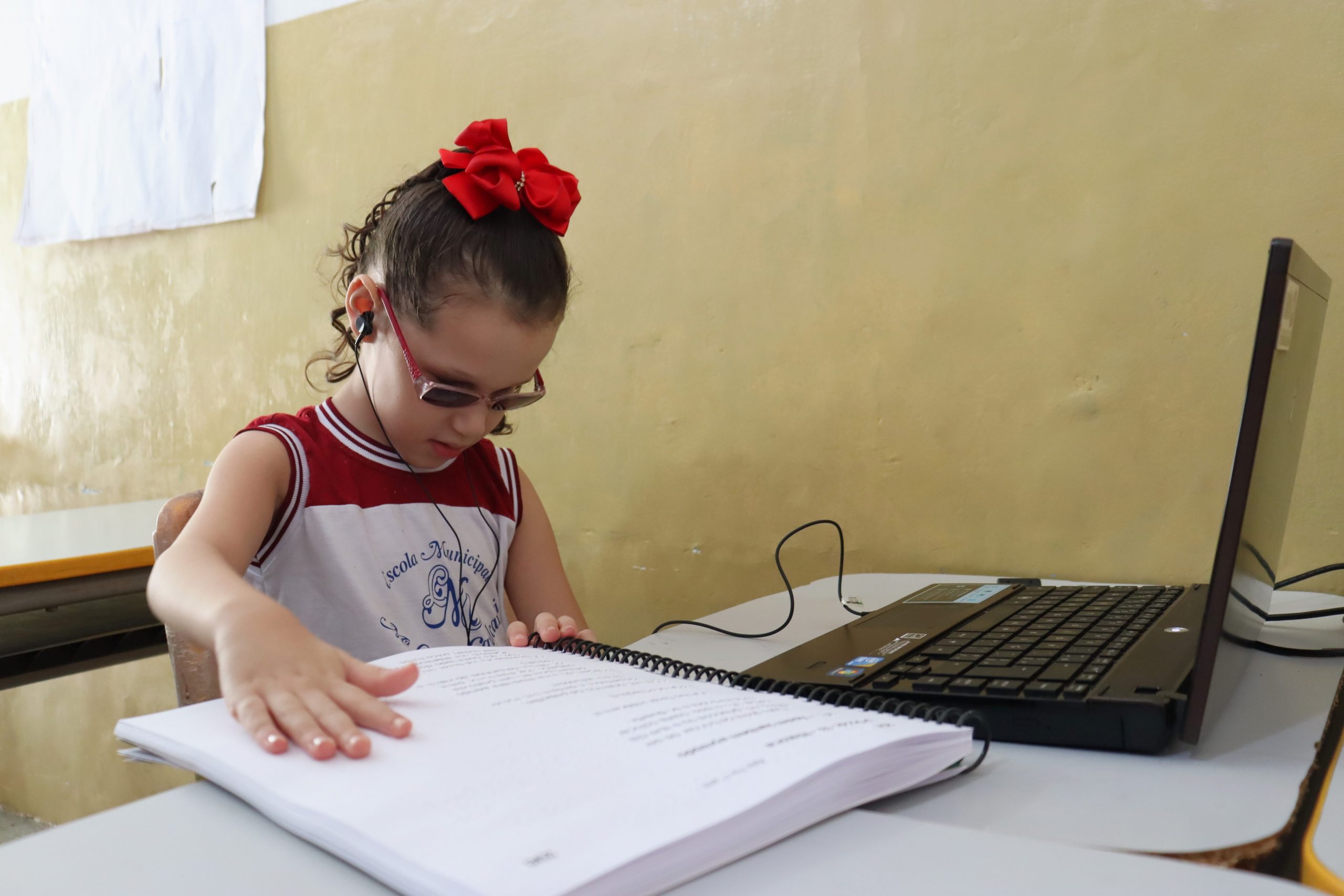 Na turminha de Pâmela não foi diferente. A presença do scanner com o notebook se tornou natural para as crianças. De cabelos loiros e com laço cor de rosa no topo da cabeça, ela conta que o que mais gosta na escola é ouvir as historinhas. Uma atividade que ficou mais fácil de ser realizada.
