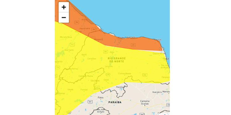 O INMET emite alerta laranja para região da Costa Branca Potiguar, que abrange os municípíos de: Mossoró, Tibau, Areia Branca, Grossos, Macau, seguindo em direção a Maxaranguape.