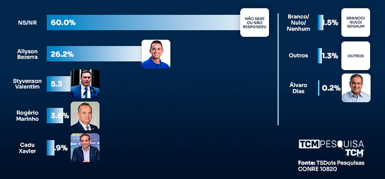 Na pesquisa espontânea, 60,0% dos entrevistados não souberam ou não responderam. Allyson Bezerra aparece com 26,2%. Styvenson Valentim surge com 5,3%. Rogério Marinho 3,6%, Cadu Xavier tem 1,9%, Branco/Nulo são 1,5%, Outros são 1,3%. E Álvaro Dias 0,2%.