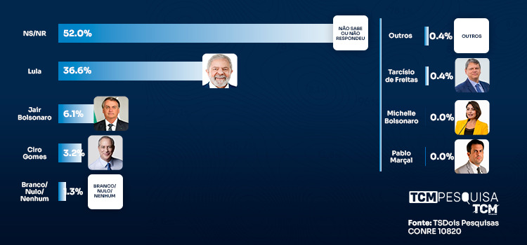 A primeira abordagem é espontânea. Não sabem/não responderam indicaram 52,0%. Lula aparece com 36,6%. Jair Bolsonaro com 6,1%. Ciro Gomes aparece com 3,2%. Branco/nulo/nenhum têm 1,3%. Outros 0,4%. Tarcísio de Freitas com 0,4%. Michelle Bolsonaro e Pablo Marçal aparecem com 0,0%.
