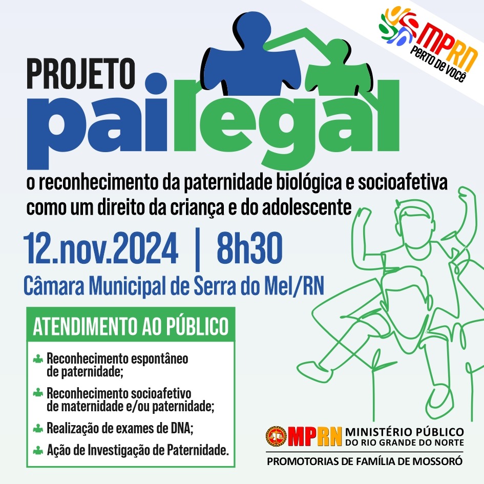 O Ministério Público do Rio Grande do Norte (MPRN), através da 18ª Promotoria de Justiça de Mossoró, realiza nesta terça-feira (12) mais uma edição do projeto “Pai Legal” em Serra do Mel. A ação, que ocorrerá na Câmara Municipal a partir das 8h30, tem o objetivo de garantir o reconhecimento da paternidade biológica e socioafetiva, assegurando o direito de crianças e adolescentes ao vínculo legal.