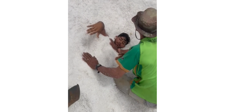 Em vídeo que circula nas redes sociais, é possível ver que o jovem teve o corpo praticamente coberto, restando somente a cabeça para fora da montanha de sal.