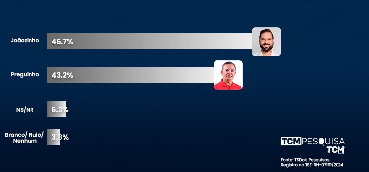 Na estimulada, o candidato Joãozinho aparece com 46,7% da intenção dos votos. Já Preguinho vem logo em seguida com 43,2%. Não sabem ou não responderam são 6,3%. Branco/Nulo são 3,8%.