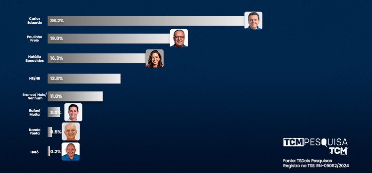 Na estimulada, Carlos Eduardo aparece 36,2%. Paulinho Freire tem 19,0%. Natália Bonavides aparece com 16,3%. Não sabe/não respondeu 13,8%. Branco/nulo/nenhum 11,0%. Rafael Mota surge com 3,0%. Nando Poeta tem 0,5%. Heró aparece com 0,2%.