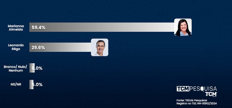 Na estimulada, Marianna Almeida tem 59,4%. Já Leonardo Rego surge com 29,6%. Branco/nulo/nenhum tem 6,0%. Não sabe/não respondeu 5,0%.