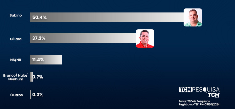 O candidato Sabino aparece com 50,4%. Já Giliard surge com 37,2%. Não sabe/não respondeu tem 11,4%. Branco/nulo/nenhum tem 0,7%. Outros têm 0,3%.