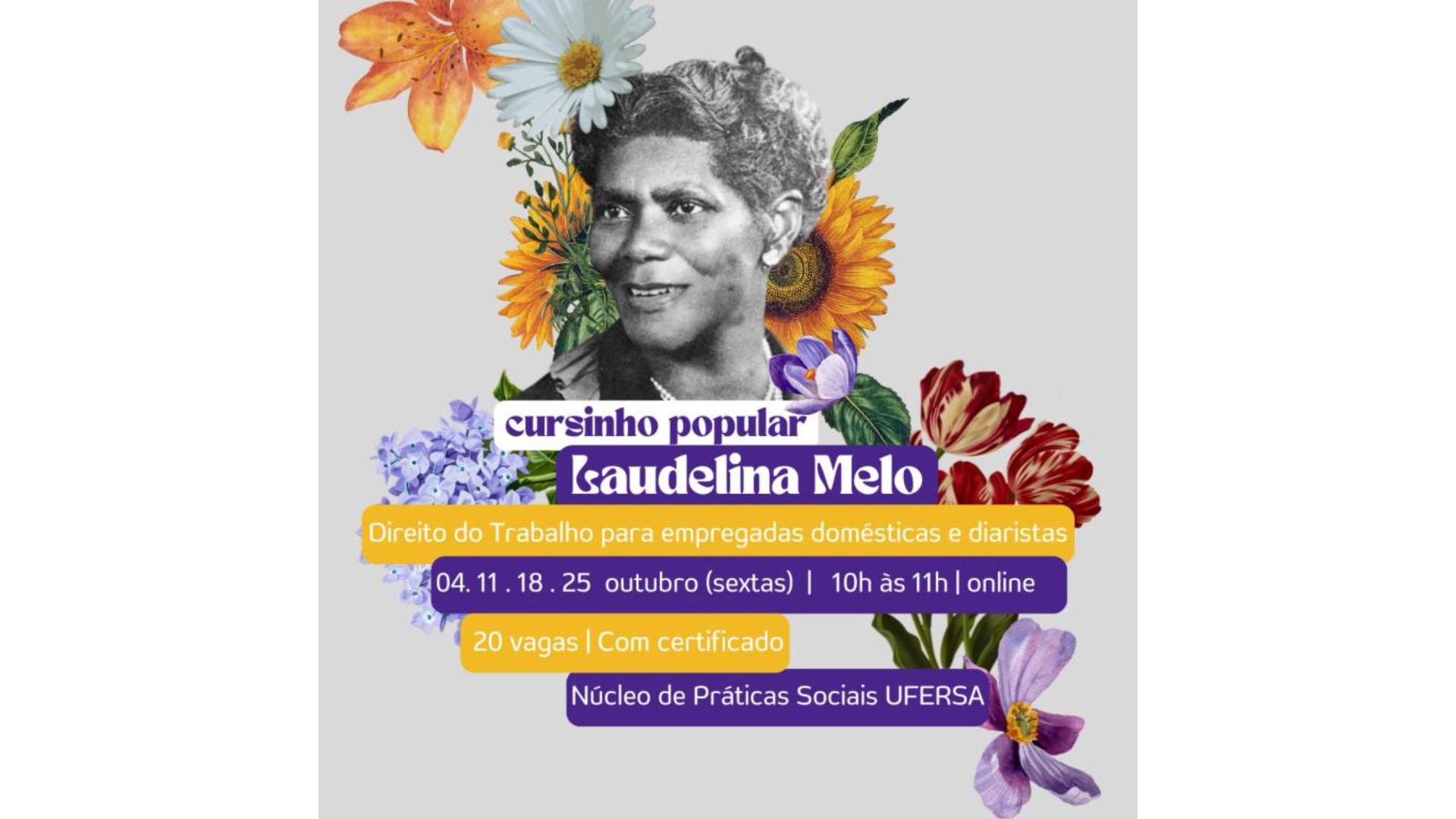 A Universidade Federal Rural do Semi-Árido (UFERSA), por meio de seu curso de Direito, lançará em outubro o “Cursinho Popular Laudelina Melo: Direito do Trabalho para empregadas domésticas e diaristas”, voltado para trabalhadoras domésticas e diaristas da cidade de Mossoró. A formação é coordenada pela professora Rayane Andrade e contará com o apoio de estudantes da disciplina de Estágio Curricular em Direito do Trabalho.