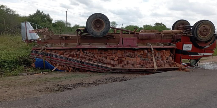 Um caminhão carregado de tijolos tombou na RN-117, na saída de Mossoró/RN para Governador Dix-Sept Rosado/RN, no início da tarde desta terça-feira (18).