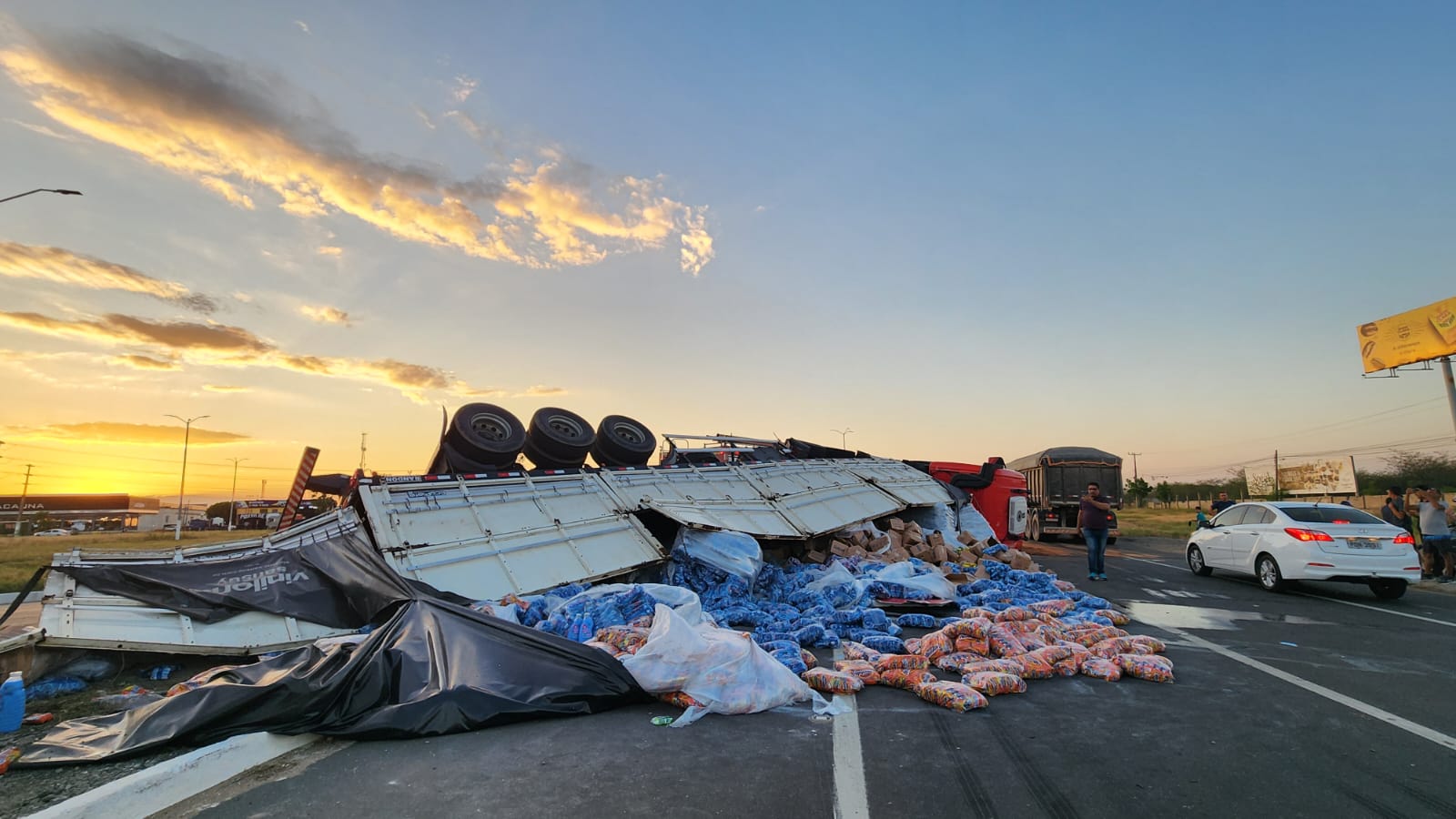 Uma carreta tombou na tarde desta sexta-feira (01), na rotatória do Thermas, localizada na BR-304, em Mossoró. O veículo transportava uma carga de produtos de limpeza, que ficou espalhada pela rodovia após o acidente.