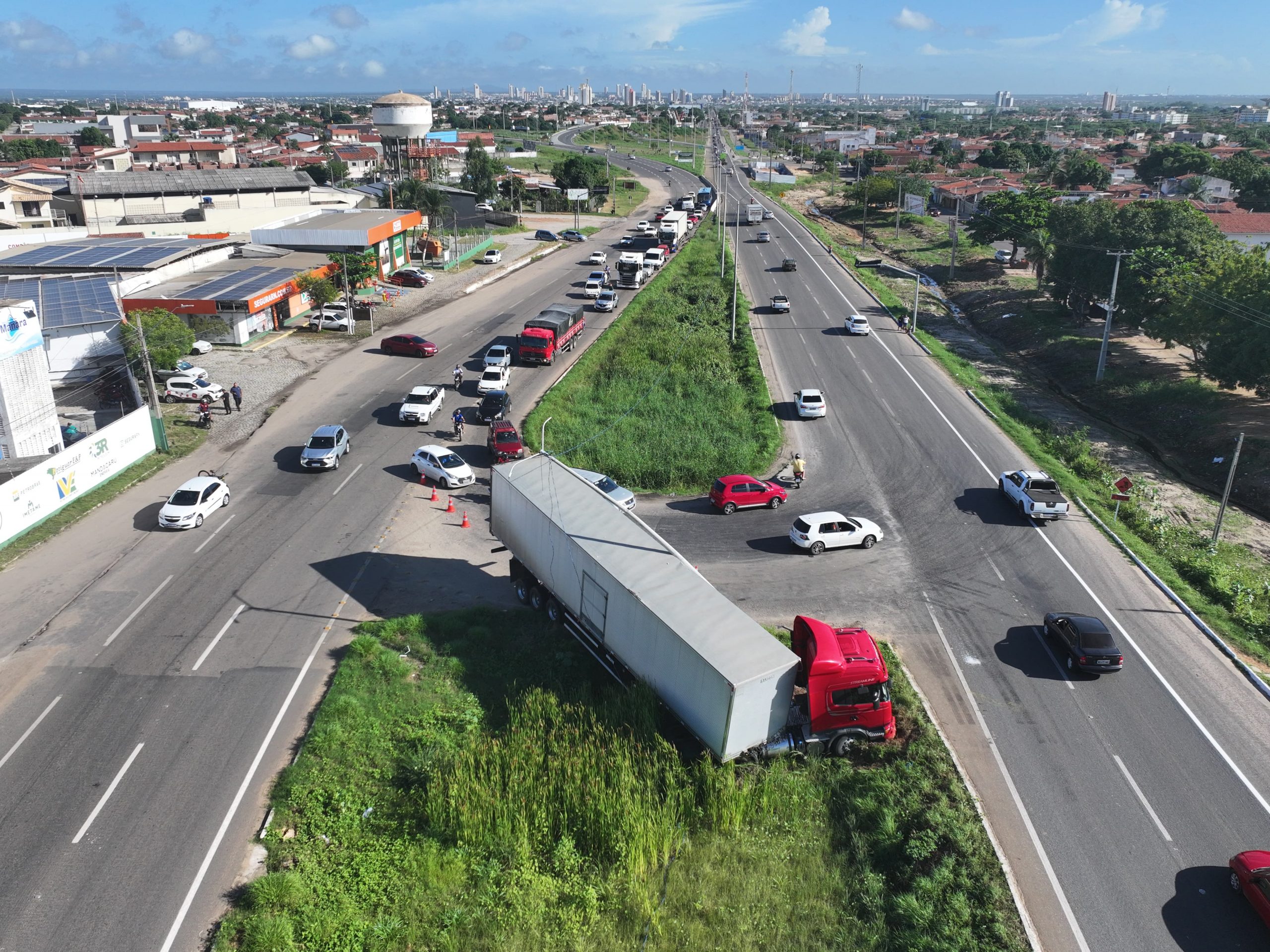 Uma carreta bateu em um poste ao tentar fazer o retorno e invadiu o canteiro. A ocorrência provocou grande congestionamento no local.