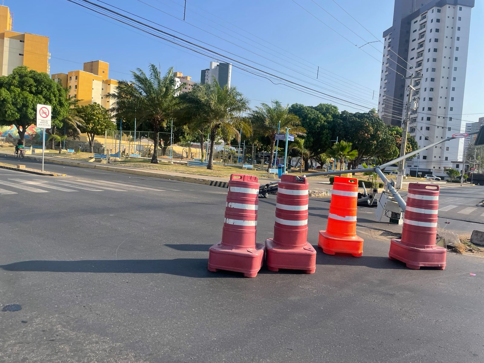 O cruzamento entre as Avenidas João da Escóssia e Antônio Vieira de Sá, no Bairro Nova Betânia, em Mossoró/RN foi interditado após um ônibus derrubar o semáforo da via.