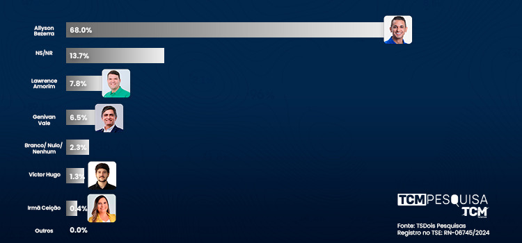 O candidato à reeleição Allyson Bezerra tem 68,0%. Não sabe/não respondeu tem 13,7%. Lawrence Amorim surge com 7,8%. Genivan Vale tem 6,5%. Branco/nulo/nenhum tem 2,3%. Victor Hugo aparece com 1,3%. Irmã Ceição tem 0,4%. Outros 0,0%