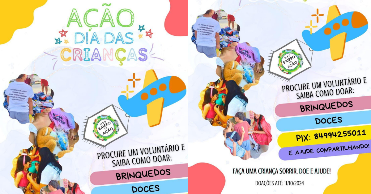 O projeto social “Meu Bairro em Ação” está realizando uma ação especial em comemoração ao Dia das Crianças, arrecadando doações de brinquedos, doces ou qualquer valor através do Pix: 84994255011. As doações poderão ser feitas até o dia 11 de outubro e serão destinadas a crianças de dois bairros em Mossoró: Belo Horizonte e Terra Prometida.