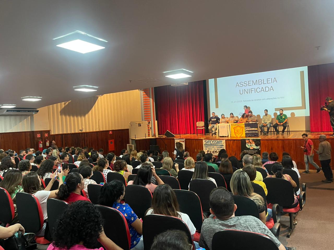 Foi realizada na manhã desta segunda-feira (19) Assembléia Geral Unificada reunindo os representantes do Sidatran, Sindiserpum, Sindssam e Sindiguardas RN, no Teatro Lauro Monte Filho em Mossoró. Na ocasião foi definida uma greve geral de todas as categorias contras os PL 17/23 e 57/23.