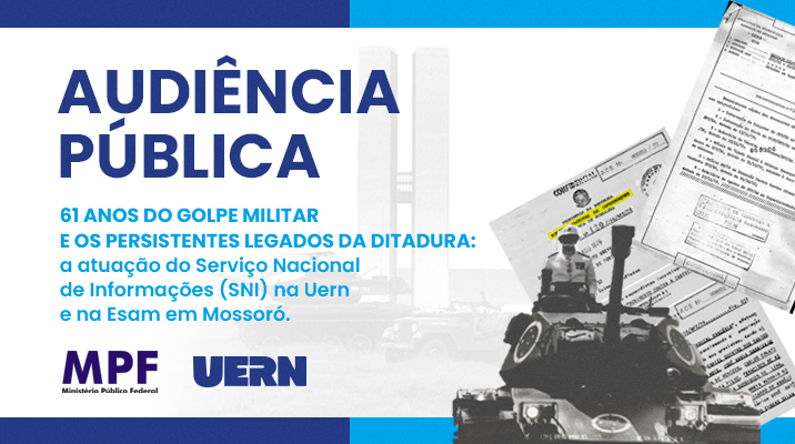 A Universidade do Estado do Rio Grande do Norte (Uern) sediará nesta quarta-feira, 2 de abril, uma audiência pública com o tema “61 anos do Golpe Militar e os persistentes legados da Ditadura: a atuação do Serviço Nacional de Informações (SNI) na UERN e na Esam em Mossoró”.