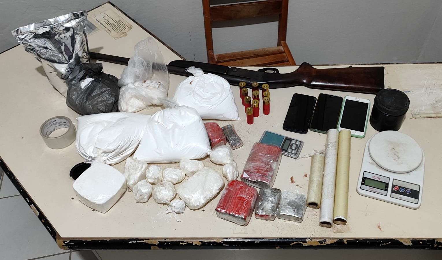 O homem também foi autuado por posse irregular de arma de fogo. Durante as diligências, os policiais apreenderam com ele 5kg de cocaína, 1,3kg de crack e cerca de 800g de maconha, além de uma espingarda calibre 12 e 10 munições.
