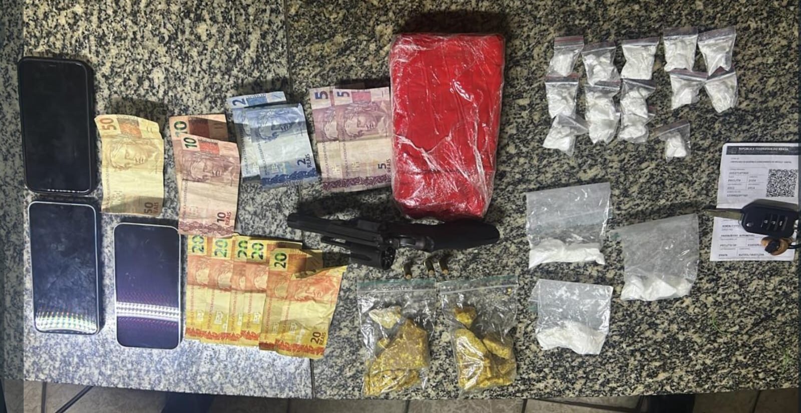 A ação se deu na noite dessa quinta-feira (22) na Rua João Firmino Regis, onde foram apreendidas aproximadamente 1kg de substância análoga à cocaína; cerca de 200g de substância análoga ao crack; 1 revólver Taurus, calibre .38; 3 munições intactas; 3 celulares de procedência desconhecida, além de R$204,00 em dinheiro.