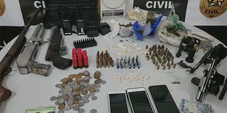 A Polícia Civil apreendeu armas e uma grande quantidade de drogas na tarde desta quarta-feira (16) em Mossoró/RN. A operação foi realizada pela Delegacia Especializada em Narcóticos (Denarc) e aconteceu no bairro Alameda dos Cajueiros.