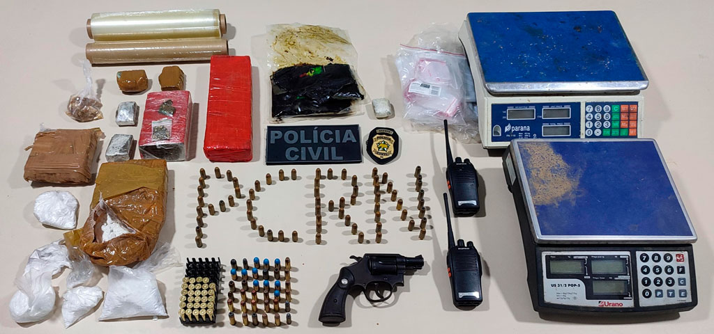 Durante as diligências, foram encontrados e apreendidos diversos tipos de drogas, entre elas maconha, cocaína, crack e haxixe, além de apetrechos utilizados para o preparo e fracionamento dos entorpecentes. No imóvel, que funcionava como depósito e laboratório de drogas, os policiais também localizaram uma arma de fogo calibre .38 e munições de calibres variados.