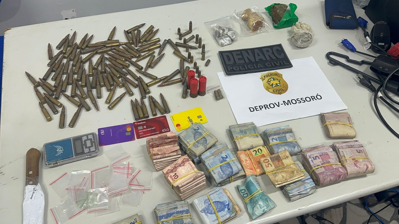 De acordo com as investigações, a ação teve início durante a “Operação Narke 2”, quando a DENARC de Mossoró, em parceria com a Delegacia Especializada de Defesa da Propriedade de Veículos e Cargas (DEPROV), identificou um galpão usado por uma facção criminosa no bairro Vingt Rosado. Durante a operação, foram apreendidos no local 100 munições de fuzil calibre 7,62mm, utilizadas em roubos a banco; três motocicletas roubadas em processo de adulteração; 84 gramas de crack; 150 gramas de maconha; quatro munições calibre .38; oito munições calibre .380; e R$ 5.700 em dinheiro, oriundos de atividades ilícitas.