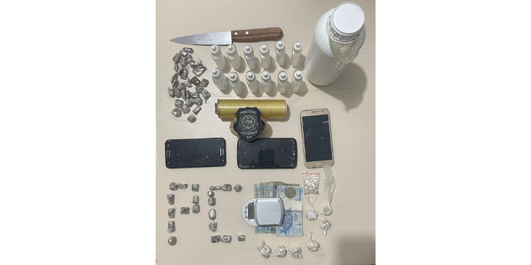 Foram apreendidas 50 trouxinhas de maconha, 90 pedras de crack e 12 frascos de loló. Além de uma balança de precisão, sacos plásticos, plásticos filme, lâminas de corte, uma faca peixeira (usada no corte da droga) e três celulares de procedência duvidosa.