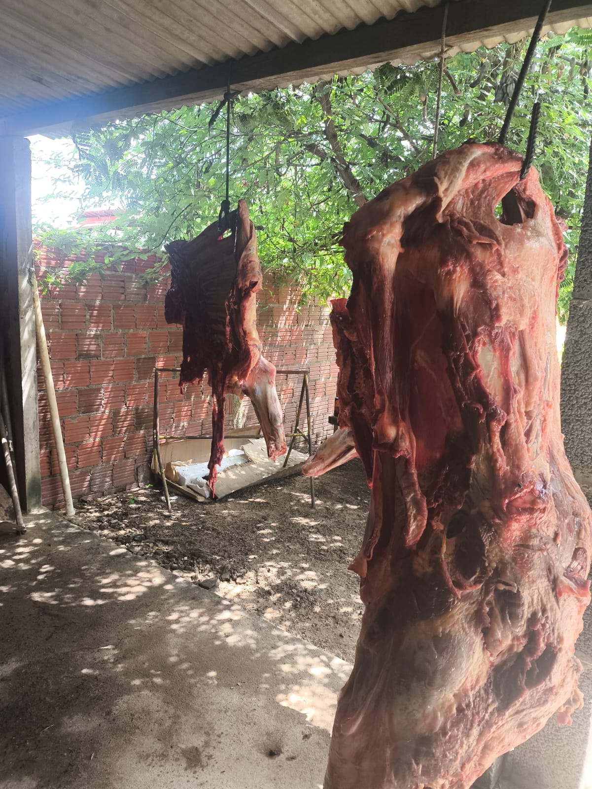 Durante a ação, foram encontrados nas casas dos suspeitos pedaços do animal pendurados em ganchos e espalhados pelo chão em vasilhas, além dos instrumentos utilizados para o abate.