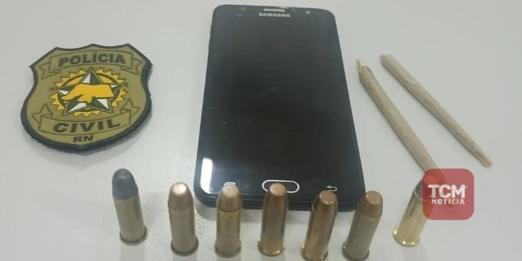 Durante o cumprimento do mandado, foram encontradas com ele sete munições de calibre 38 e pequena quantidade de maconha.