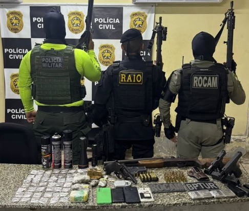 Na ação, os policiais apreenderam duas pistolas com carregadores e munições, um revólver, uma escopeta calibre 12, além de porções de maconha, crack e cocaína. Outros materiais de origem ilícita também foram encontrados.