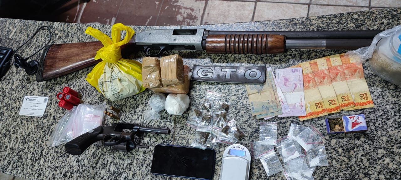 Tratava-se de um adolescente de 16 anos e que estava de posse de uma espingarda calibre 12 de repetição, municiada com 4 munições de igual calibre e carregava uma mochila nas costas onde conduzia um revólver calibre 38 marca Taurus também municiado com 4 munições de igual calibre. Na mochila ainda levava balança de precisão,R$ 94, um celular, vários materiais para fracionar e embalar drogas, além de produtos ilícitos análogo de cocaína, e maconha.