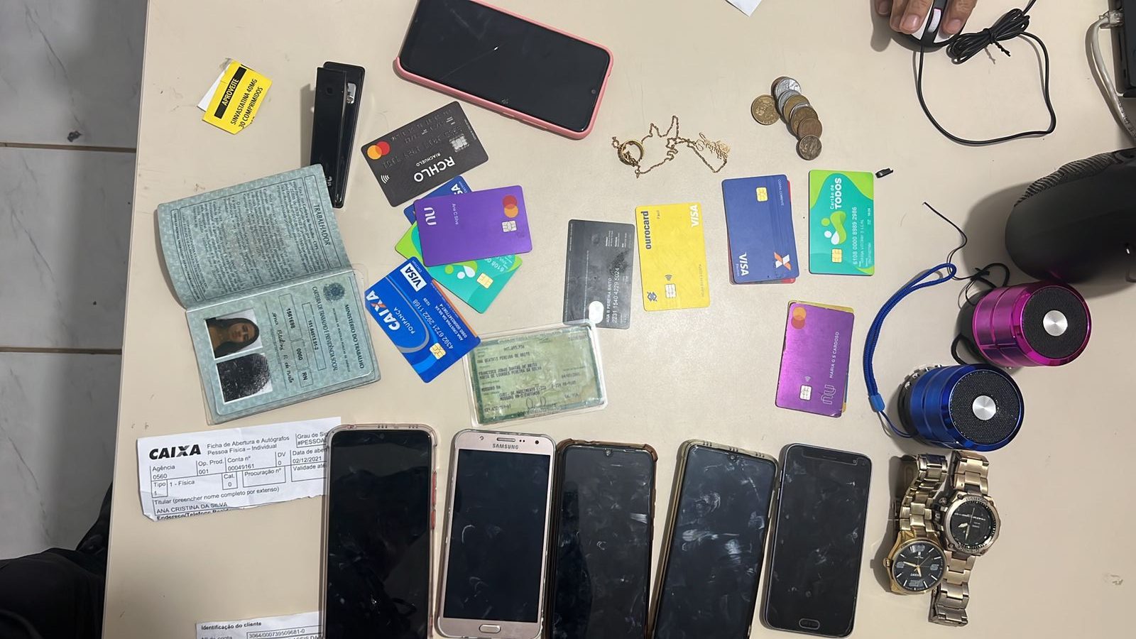 De acordo com a polícia a suspeita era considerada foragida da justiça por outros crimes e estava com um mandado de prisão em aberto expedido pela justiça da comarca de Mossoró. Com Ana Beatriz foram apreendidos vários objetos de procedência duvidosa, entre eles seis aparelhos de celular, vários cartões de créditos, dois relógios, além de outros materiais.