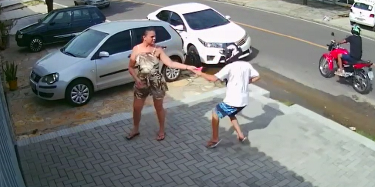 No vídeo é possível ver uma mulher, na calçada de casa com o celular na mão, quando dois homens se aproximam em um moto e pedem o aparelho. A mulher até tenta entrar dentro de casa, é alcançada pelos assaltantes antes de conseguir. Logo em seguida eles deixam o local.